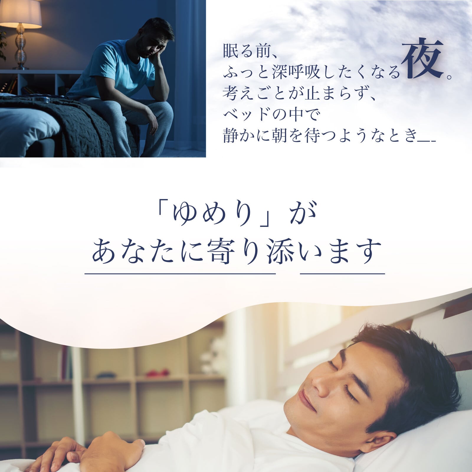 考えごとが止まらず、ベッドの中で静かに朝を待つようなとき――「ゆめり」は、そんなあなたの新しいナイトルーティンに寄り添います。