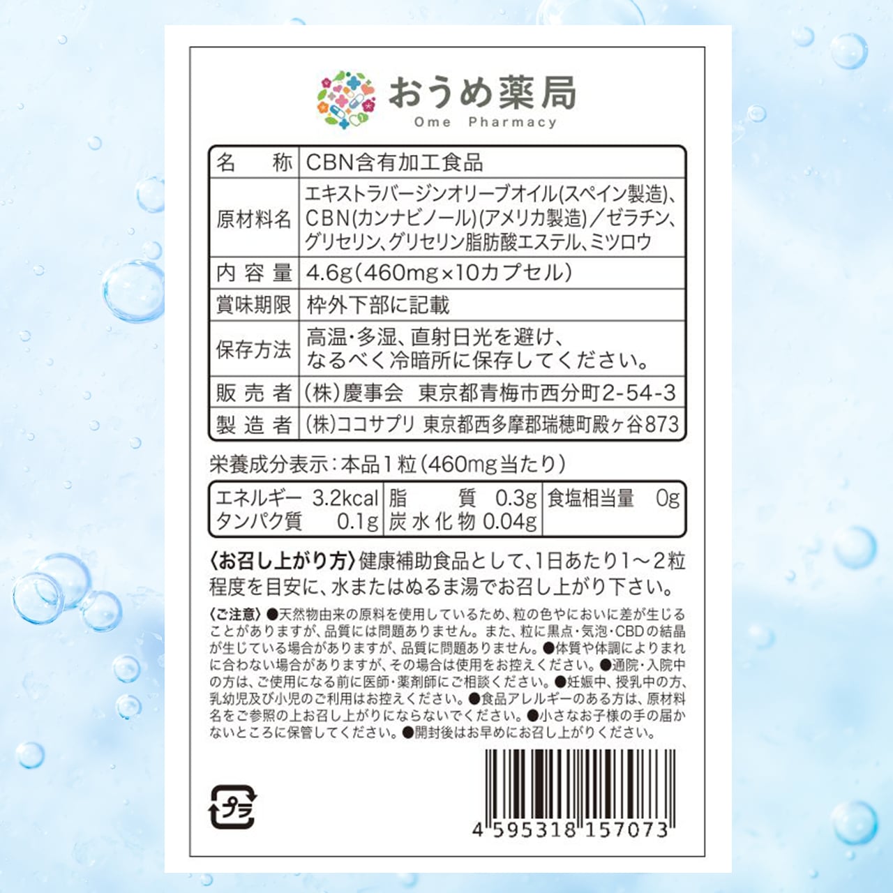エキストラバージンオリーブオイル(スペイン製造)、CBN(カンナビノール)(アメリカ製造)/ゼラチン、グリセリン、グリセリン脂肪酸エステル、ミツロウ