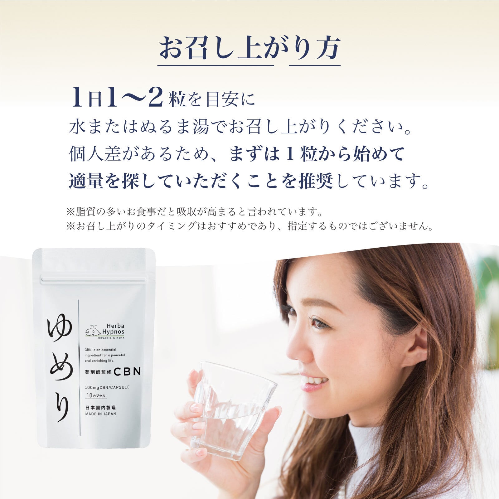 また、「ゆめり」はCBNの摂取を「手軽」に「続けやすい」形を追求した結果、カプセルタイプとしました。